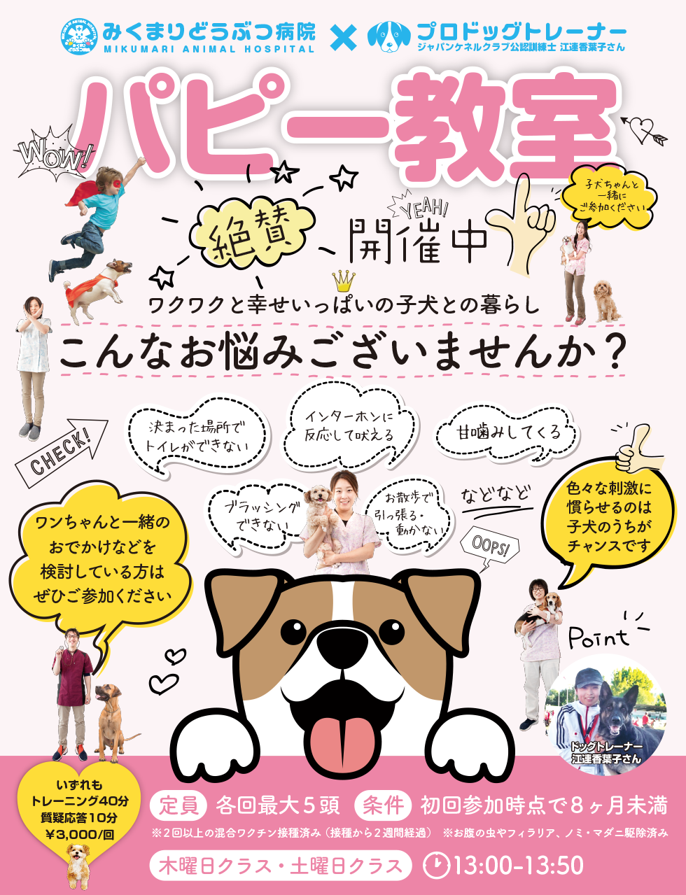 ★パピークラスは、当院かかりつけのワンちゃんでれば参加が可能です。詳細はお電話または病院受付までお問い合わせをお願いいたします。